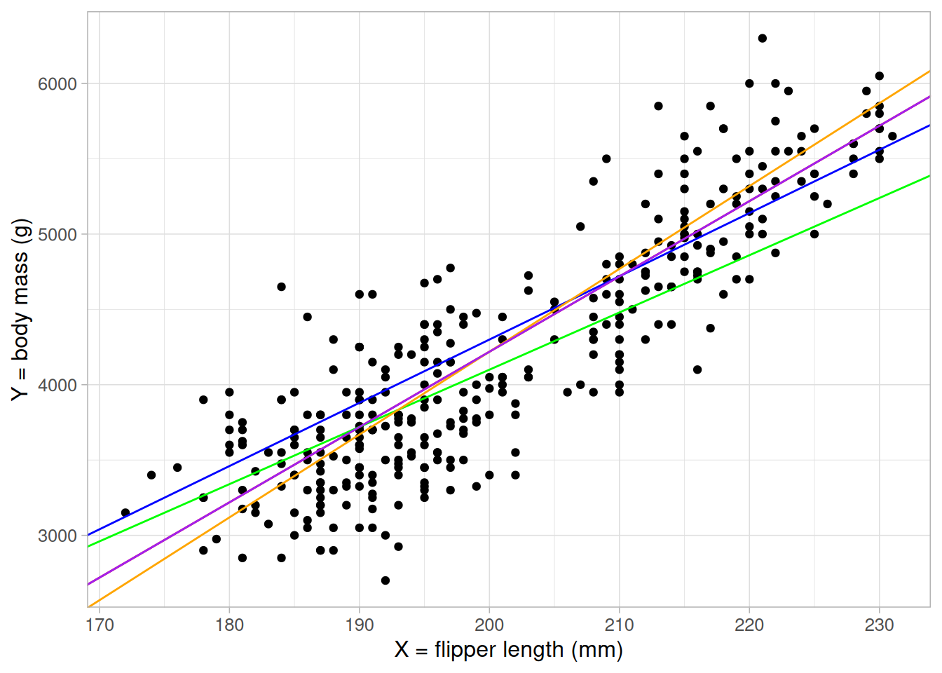 : this returns the estimate of \(\beta_0\) from Equation 3.3, the expected value of the outcome where all covariates are 0. Often, the intercept value will not have a meaningful interpretation. For example, here it tells us the expected body mass of penguins with flipper length 0mm is [-5780.83g]flipper_length_mm