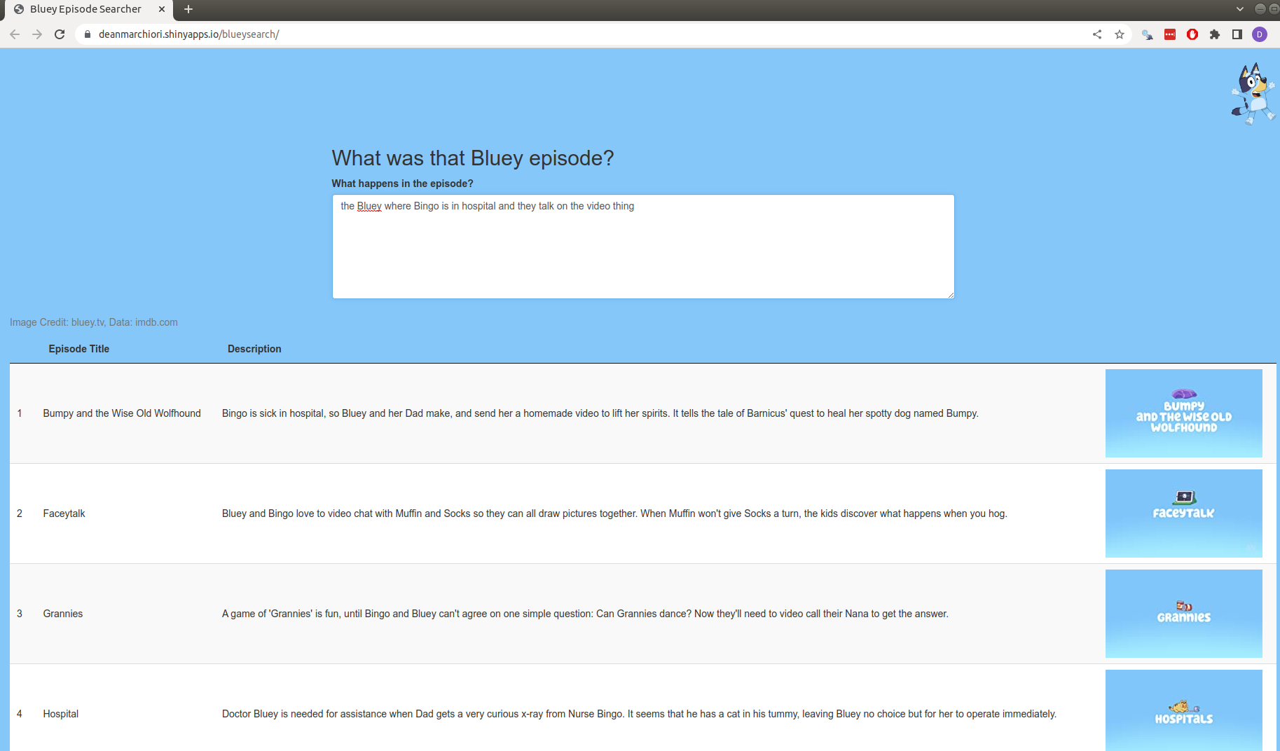 A website that lets you type in the vague descriptions of a small child and it will return a mathematically ranked list of closest matching Bluey episodes.